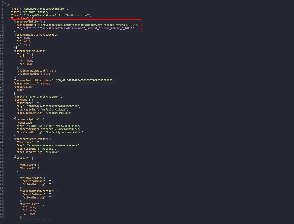 <figure><img src="https://667545377-files.gitbook.io/~/files/v0/b/gitbook-x-prod.appspot.com/o/spaces%2FhxlXc7fbSpMhUpsCjEE9%2Fuploads%2F2JbENYM3mN2bhFNKK2DY%2FPickaxeWeaponDefinition.png?alt=media&#x26;token=adc133e9-09f3-45d8-be0d-02f6a6a79dba" alt=""><figcaption></figcaption></figure>