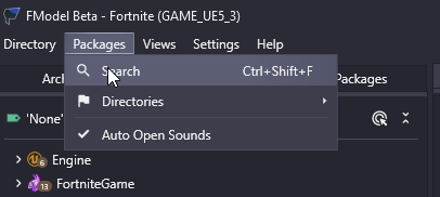 In order to find the WeaponDefinition for your pickaxe, we will use FModel. If you are not familiar with FModel, please refer to their [documtation](https://github.com/4sval/FModel/wiki/Getting-Started). To get started, locate 'Packages' and click 'Search'.